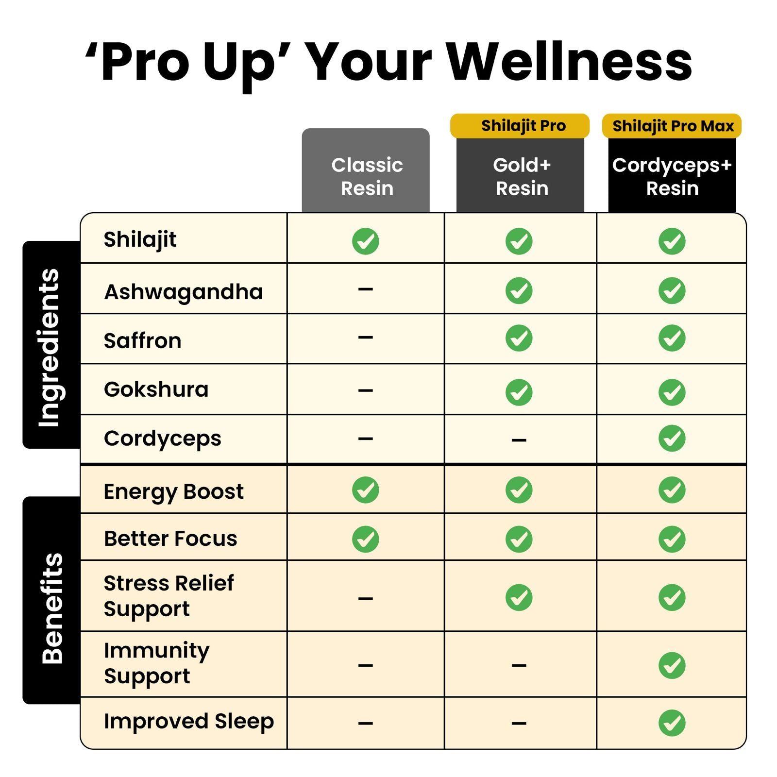Gold+ Shilajit is a premium variant with 600mg per serving, compared to 400mg for Shilajit Resin. Gold+ also contains added Ashwagandha for enhanced stress support.